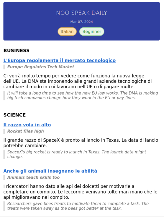 Hi everyone! I've been working on a web app called Noo Speak that helps you practice languages through daily news summaries on topics you want to hear about.